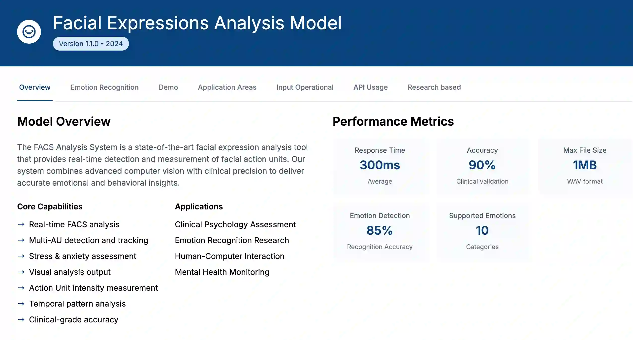 Our FACS-based emotion recognition system analyzes facial action units to detect and quantify seven core emotions: Joy, Sadness, Anger, Fear, Surprise, Disgust, and Contempt.
