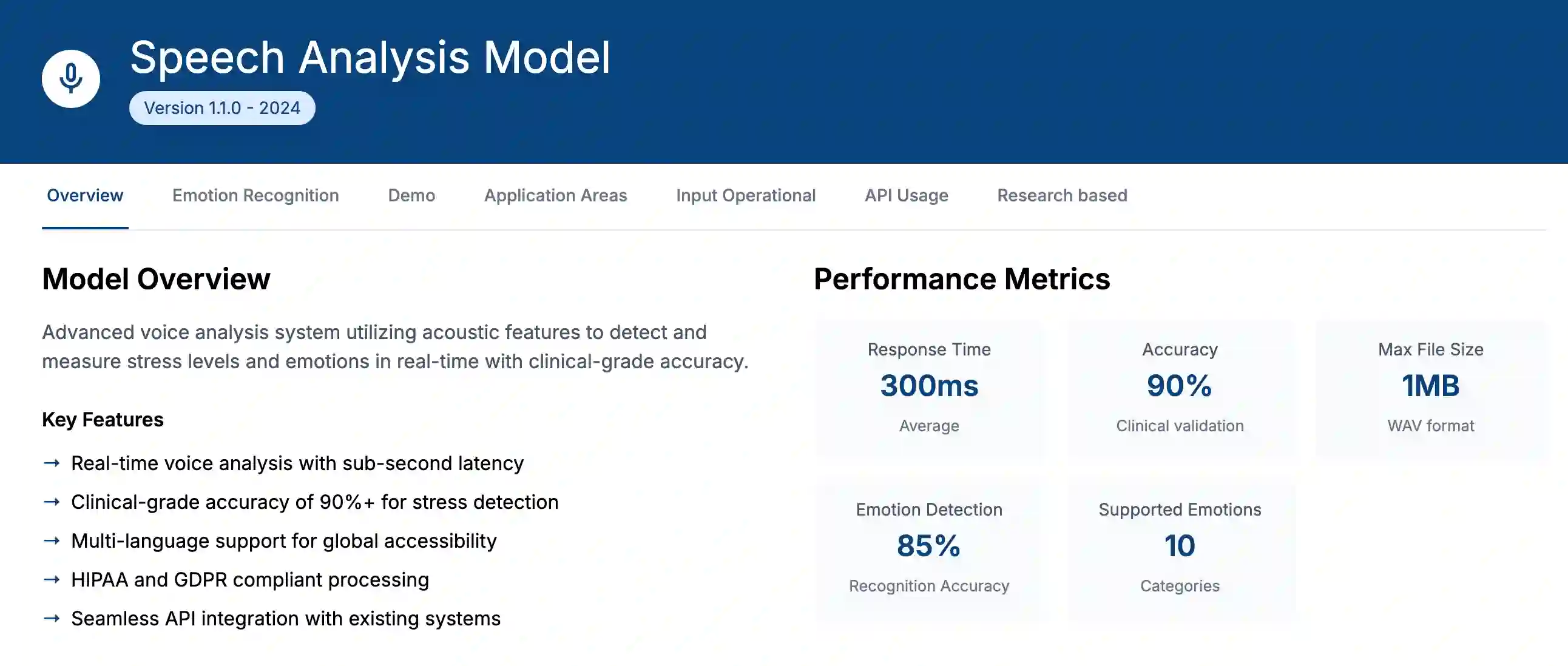 The Speech Analysis Model is grounded in a robust body of academic and clinical research, combining state-of-the-art deep learning architectures with well-validated acoustic and prosodic features. The underlying methodologies draw upon research in audio signal processing, speech emotion recognition, and clinical linguistic analysis.